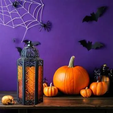 VELA LANTERNS Moroccan Candle Lantern Decorative Candle Holder Lamp for Table or Hanging, Ramadan and Halloween Decorations, Outdoor Patio or Porch, Weddings, Black Metal, Amber Orange Glass, Medium