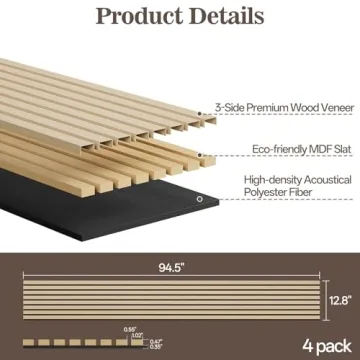 Show moreIntroduce your home to an exquisite blend of style and functionality with the Vellorise 4 Pack Wood Panels for Wall. Each panel measures an impressive 94.4" x 12.8", allowing you to cover up to 33 sq. ft. of wall space effortlessly. These panels aren't just for decoration; they double as acoustic sound absorption solutions, perfectly suited for elevating your living spaces. Crafted from environmentally-friendly materials, including P2-grade MDF and high-density polyester fiber, these panels are designed for durability while ensuring a healthier indoor atmosphere. Ideal for creating a modern aesthetic, their natural wood finish and 3D texture bring a touch of elegance to any room, enhancing both comfort and visual appeal. Whether you're updating your living room, transforming a home office, or designing a cozy bedroom, these wood panels are an excellent choice that offers undeniable value and style.