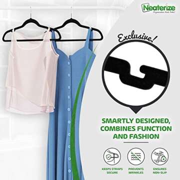 Show more Transform your closet into a sleek and organized space with our premium velvet hangers, a must-have for anyone seeking efficiency and style. Crafted with a unique slim design, these hangers significantly save space, allowing you to fit more clothes neatly without the bulkiness of traditional options. Their ultra-soft velvet material not only prevents even the silkiest fabrics from slipping off but also provides a luxurious touch to your wardrobe.