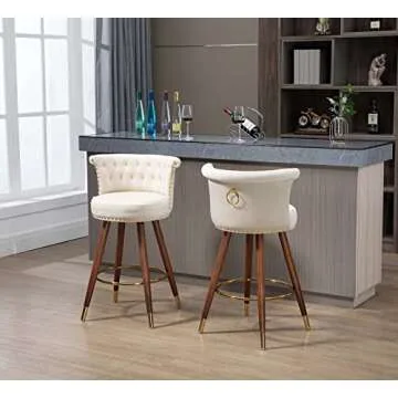 Show moreIntroducing the Velvet Swivel Bar Stools Set of 4, an exquisite addition to your home that seamlessly blends functionality with sophisticated design. Coming in a creamy ivory color, these counter height barstools feature a tufted backrest elegantly adorned with classic golden rivets, a tasteful gold ring on the backrest edge, and curling design elements that impart a retro yet chic aesthetic. Crafted with a robust solid rubber wood base and complemented by a sleek round footrest, these stools not only promise stability and support but also elevate the style quotient of any space, be it a kitchen island, dining area, or a trendy café.