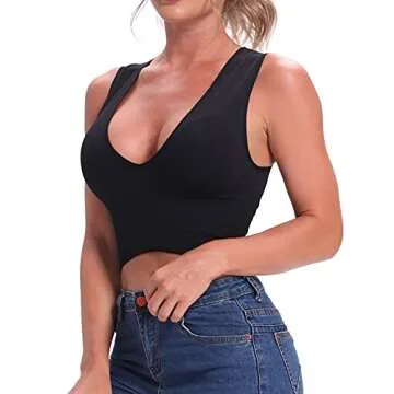 Venbond Women's Sexy Sleeveless Seamless Crop Top Deep Plunge V Neck Ribbed Tank Top with Removable Pads (Black, M)