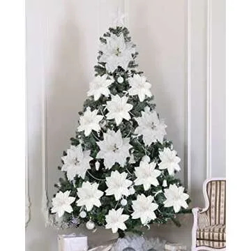 Show more Transform your holiday season into a spectacular celebration with our exquisite collection of white poinsettia flowers. Crafted from a unique, flexible fabric, these non-breakable ornaments will add a touch of elegance to your Christmas decorations. Each flower measures a perfect size of 5.5 inches in diameter, making them an ideal choice for adorning your Christmas tree or enhancing wreaths and floral arrangements. With a delightful pack of 24 pieces, you can easily fill bare spots in your holiday displays, bringing joy and festivity into your home.