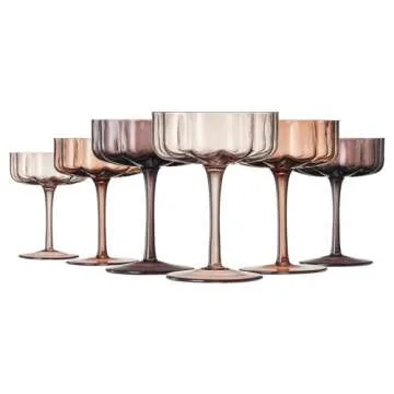 Venus Glasses Luxury Glassware - Set of 6 - Everyday, Holiday Gift Her, Mom, Wife, Girlfriend, Special Celebrations Drinkware, Christmas, Textured Glass, Brown Style Amber Colored - Flower Coupes 7oz