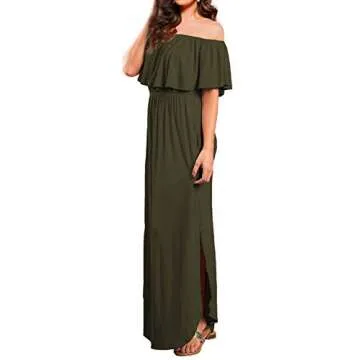 VERABENDI Women's Off Shoulder Summer Casual Long Ruffle Beach Maxi Dress with Pockets Army Green XL