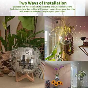 Show moreThe Veramz Disco Ball Planter 8" is not just an ordinary planter; it’s a dazzling piece of art designed to add a touch of glam and fun to your indoor gardening experience. Made from high-quality materials, this stylish hanging planter features a unique mirror ball design that reflects light beautifully, creating an enchanting ambiance in any space. Ideal for showcasing your favorite indoor plants, the planter is equipped with a durable macrame rope chain and a sturdy wooden stand, ensuring stability while allowing your plants to flourish. Plus, with a built-in drainage hole and plug, it allows for proper water management, making it perfect for any plant enthusiast. Transform your home with this striking yet functional decor piece!