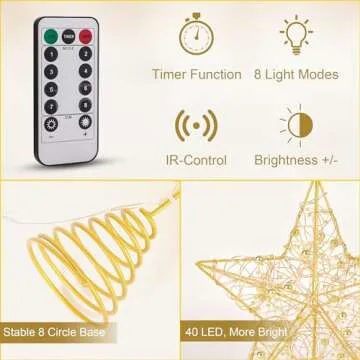 Show moreIlluminate your holiday season with the exquisite Verdenu Christmas Tree Topper. This stunning 40 LED star-shaped topper is meticulously designed to enhance the festive ambiance of your home. With its brilliant lights, it shines brightly against the dark, bringing joy and cheer to your family gatherings. The warm gold beads add a touch of elegance, making it not just a decoration, but a centerpiece for your Christmas tree. Measuring at a perfect size of 10*8 inches (25*20 cm), it's ideal for most Christmas trees, ensuring your decorations stand out in the best possible way.