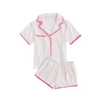 Show moreIndulge in the softest embrace of relaxation with the Verdusa Women's 2 Piece Button Front Short Sleeve Top and Short Sleepwear Pajama Sets, thoughtfully crafted for comfort and style. This pajama set features a delightful V-neck neckline that adds a touch of sophistication while the adorable pocket patched design combines functionality with flair. The fabric is not only soft against the skin but also exhibits remarkable stretch, ensuring a fit that's true to size and perfect for all-night lounging. The beautiful white and pink hues, combined with charming details such as contrast binding and practical short sleeves, make this set a must-have for cozy nights and casual pajama gatherings.