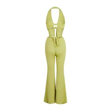 The companion piece, high-waisted flare leg pants, come equipped with a wide waistband to enhance comfort and to define your waistline gracefully. Perfect for any casual occasion or a night out, this outfit transitions effortlessly from day to evening with the right accessories. The lightweight and breathable material makes it an ideal choice for warm weather, offering both style and functionality.