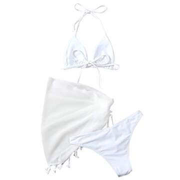 The Verdusa Women's 3 Piece Bathing Suit Triangle Bikini Swimsuit Set is a stunning ensemble designed for the confident woman ready to make waves. This fabulous set, available in a pristine white, features a classic triangle bikini top that flatters every figure while providing adjustable straps for a customized fit. The matching bikini bottoms ensure comfort and style, and when paired with the chic cover-up skirt, you’ll be beach-ready in no time. Made from high-quality materials, this...