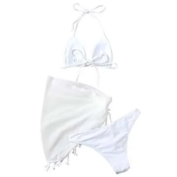 Show moreThe Verdusa Women's 3 Piece Bathing Suit Triangle Bikini Swimsuit Set is a stunning ensemble designed for the confident woman ready to make waves. This fabulous set, available in a pristine white, features a classic triangle bikini top that flatters every figure while providing adjustable straps for a customized fit. The matching bikini bottoms ensure comfort and style, and when paired with the chic cover-up skirt, you’ll be beach-ready in no time. Made from high-quality materials, this swimsuit set promises durability without sacrificing style, making it the perfect addition to your swimwear collection.