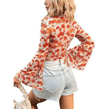 Verdusa Women's Bell Sleeve Lettuce Trim Mock Neck Floral Mesh Top Crop T Shirt Red Multi Large