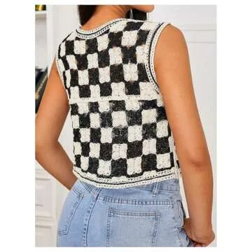 Introducing the Verdusa Women's Button Front V Neck Sleeveless Checkered Knit Sweater Vest in stylish black and beige. This chic crop sweater is designed for the modern woman who values both comfort and style. Crafted from a soft fabric that boasts a little stretch, it promises to give you a flattering fit while providing ease of movement. The trendy checkered pattern adds a touch of character, perfect for elevating the simplest of outfits. Its V...