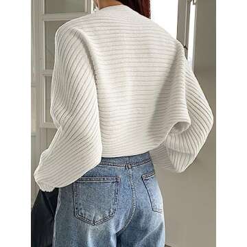 Show moreIntroducing the Verdusa Women's Casual Long Sleeve Open Front Crop Sweater Cardigan Bolero Shrug in a pristine white rib design. Crafted from a soft and warm knitted fabric, this cardigan is designed to provide both comfort and style. With a slight stretch, it moves with you and ensures a flattering fit that enhances your silhouette. The oversized batwing sleeves and asymmetrical hem add a unique element to your outfit, making it the perfect layering piece for various occasions. Whether you're going out for a stylish dinner, hitting a holiday party, or simply lounging at home, this cardigan fits seamlessly into your wardrobe, offering versatility and charm.
