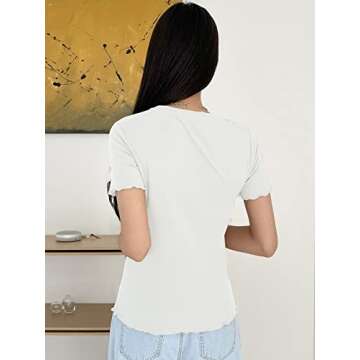 Verdusa Women's Casual Short Sleeve Crewneck Lettuce Trim Ribbed Knit T-Shirt Basic Tee Top Solid White S