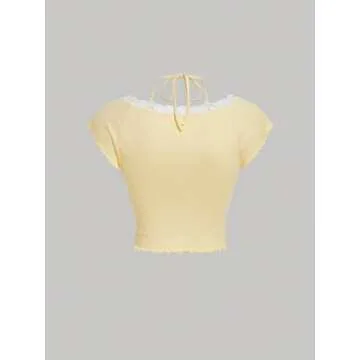 Verdusa Women's Contrast Lace Halter Neck Lettuce Trim Casual Crop Tee Tops Yellow Small