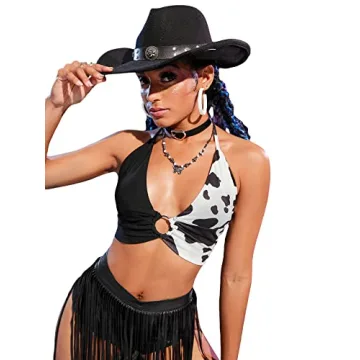 Whether you’re dancing at a festival, enjoying a casual brunch, or simply taking a stroll under the sun, the deep V neck and stylish knot at the back add an unexpected chic factor to your ensemble. The Stylish Verdusa Cow Print Crop Halter Top pairs effortlessly with high-waisted jeans, skirts, or shorts, allowing you to mix and match for a myriad of looks that will keep you feeling fabulous and confident.