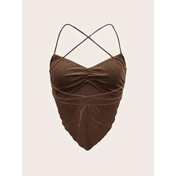 Show moreElevate your wardrobe with the Verdusa Women's Criss Cross Backless Strappy Asymmetrical Hem Crop Cami Top in a chic mesh coffee brown color. This stunning piece is designed for the modern woman who seeks both style and comfort. Crafted from a soft fabric featuring a hint of stretch, this cami top offers unparalleled comfort for all-day wear. The v-neck design and sleeveless silhouette showcase your figure beautifully, while the unique asymmetrical hem adds a trendy twist to your outfit.