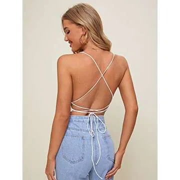 Verdusa Women's Criss Cross Backless Strappy Asymmetrical Hem Crop Cami Top White S