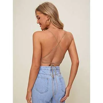 Features: v neck, sleeveless, spaghetti strap, backless, asymmetrical hem, strappy cami top