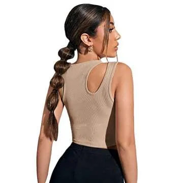 Verdusa Women's Cut Out Sleeveless Round Neck Slim Fitted Ribbed Tank Crop Top Khaki M