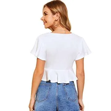 Verdusa Women's Deep V Neck Flutter Sleeve Ribbed Peplum Top Crop Blouse