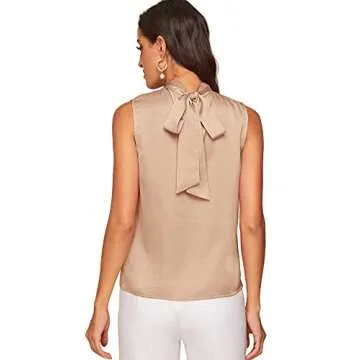 Verdusa Women's Elegant Tie Back Sleeveless Pleated Mock Neck Satin Blouse Top Khaki S