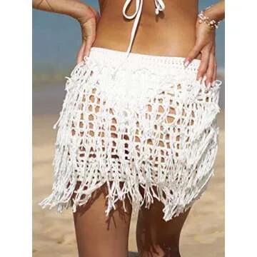 Verdusa Women's Fringe Trim Hollow Out Crochet Short Skirt Cover Up White Small
