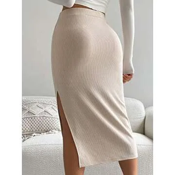 Verdusa Women's High Waist Slit Hem Rib Knit Midi Bodycon Skirt Beige S