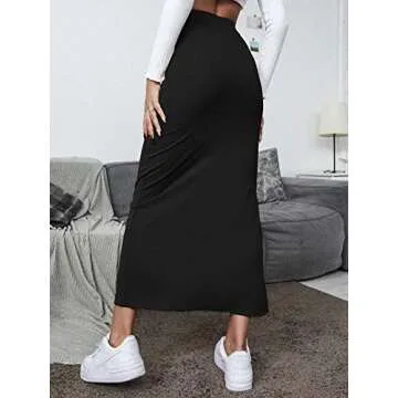 Show moreDiscover the Versatile Charm of the Verdusa Women's High Waisted Split Thigh Rib Knit Long Bodycon Skirt in Black. This stunning skirt combines comfort with a sultry aesthetic, making it a wardrobe essential for any fashion-forward individual. Crafted from a high-quality rib-knit material, this body-hugging skirt is designed to flatter your figure while ensuring maximum comfort. Its high-waisted design provides excellent tummy control, creating that desired illusion for an effortlessly chic look. The daring thigh-high slit not only adds a touch of drama but also offers the perfect balance of modesty and allure, making it ideal for both daytime and evening outings.