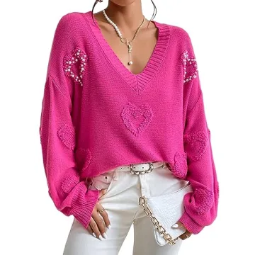 Embrace elegance and comfort with the Verdusa Women's Pearls Heart V Neck Drop Shoulder Sweater in Hot Pink. Crafted from a soft, stretchy fabric, this oversized knit top features a deep V neckline, drop shoulders, and long sleeves for a relaxed yet chic silhouette. The textured design is accentuated with delicate pearl beading, adding a touch of sophistication to your casual or dressy outfits. Perfect for lounging, dating, daily wear, or making a statement on the street, this sweater combines style with...