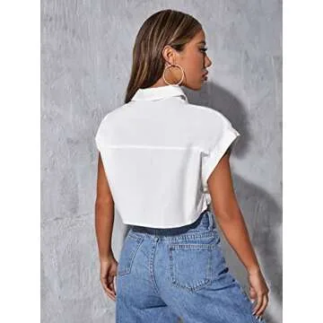 Show moreStep into style with the Verdusa Women's Pocket Front Roll Up Cap Sleeve Button Down Crop Blouse Top. This exquisite piece is designed for the modern woman who values both comfort and fashion. Crafted from a soft fabric that ensures all-day wear without any discomfort, this blouse features a fashionable collar and unique batwing sleeves, adding a touch of elegance to your outfit. The dual pockets offer both functionality and style, perfect for keeping your essentials close. Its chic rolled cuff gives it a laid-back vibe while the button-up front allows for easy wear and versatile styling options. Standing at a crop length, this blouse is ideal for showcasing your stylish high-waisted pants or skirts and transitions seamlessly from day to night.