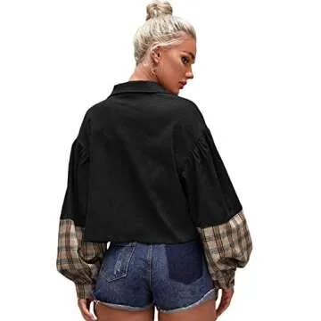 The **Verdusa Women's Puff Long Sleeve Pocket Front Plaid Casual Tartan Outerwear Corduroy Jacket** is an exquisite blend of style and functionality. This eye-catching crop trucker jacket features a vibrant spliced plaid pattern that adds a twist to traditional outerwear. With its drop shoulder design and bishop sleeves, this jacket elevates your casual outfits, making it perfect for a day out or a cozy evening gathering. Crafted from high-quality corduroy fabric, it offers a soft touch without any stretch,...