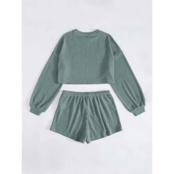 Verdusa Women's Rib Knit Long Sleeve Lounge Set 2 Piece PJ Set Nightwear Pajama Set Green L