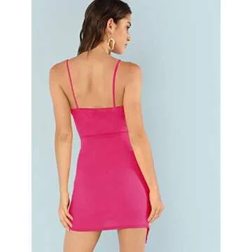 Verdusa Women's Sexy Ruched Side Asymmetrical V Neck Bodycon Cami Dress Hot Pink S