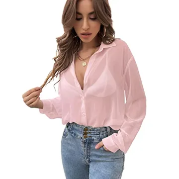 Show moreIntroducing the Verdusa Women's Sheer Mesh Button Down Shirt Top, an exquisite addition to your wardrobe that epitomizes elegance and versatility. Crafted with meticulous attention to detail, this lightweight blouse features a stylish lapel collar and long sleeves, making it the ideal choice for layering on various occasions or showcasing a chic look on its own. The transparent design promotes a daring allure, allowing for creative styling with a bralette, tank, or cami underneath. Whether you’re pairing it with your favorite skirt, jeans, or shorts, this blouse is bound to become your new go-to piece.