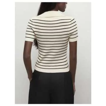 Sweater tee features with collared neck, stripe print, short sleeve, button front, ribbed knit, slim fit