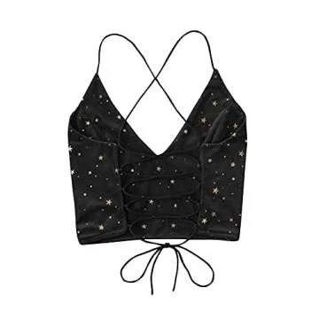 Show more Introducing the Verdusa Women's Velvet Galaxy Print Crisscross Back Spaghetti Strap Crop Cami Top, a stunning blend of style and comfort that is designed to make a statement. Crafted from **soft velvet fabric**, this top offers not just a stylish look but also the luxurious feel of high-quality material against your skin. Its V-neckline and sleeveless design create a flattering silhouette, while the unique star print adds a touch of cosmic charm. The tied back feature not only provides a chic detail but also allows for an adjustable fit, ensuring that you feel confident and comfortable while dazzling at any event.