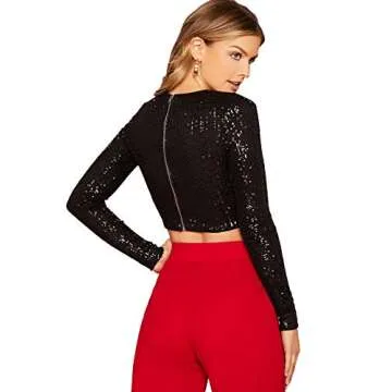 Show moreIntroducing the dazzling Verdusa Women's Zip Up Back Sequin Glitter Slim Fitted Crop Tee Top, a sensational piece that perfectly blends style and comfort! This exquisite crop top features a unique zip-up back design, making it not only a fashion statement but also a functional element that provides a snug fit, letting you flaunt your silhouette with confidence. Made by the reputable brand Verdusa, this top is crafted from a high-quality stretchy fabric that feels wonderful against your skin, ensuring all-day comfort. With its captivating black sequins, it shimmers beautifully under any light, guaranteeing that you'll turn heads every time you wear it.