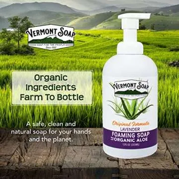Show moreIntroducing the VERMONT SOAP Organic Lavender Foaming Hand Soap – a hand-crafted, nourishing solution for your daily cleansing needs. Made exclusively from natural and organic ingredients, this foaming hand soap is gently formulated to pamper even the most sensitive skin. Our expert Master Soapmakers at Vermont Soap have dedicated more than 30 years to refine this soap, ensuring you get the soothing touch of organic oils without the harsh remnants of traditional detergent products. This lavender-scented wonder combines the calming essence of nature with the practicality of everyday use, making it a must-have for your bathroom or kitchen sink.