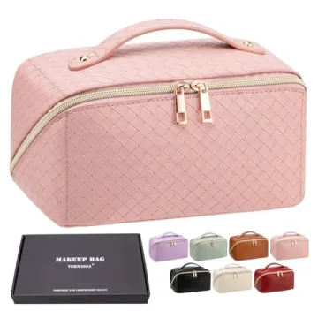 VERNASSA Large Capacity Travel Cosmetic Bag, Toiletry Bag, Women Portable Makeup Bag Opens Flat for Easy Access, PU Leather Waterproof Travel Cosmetic Bag with Handle and Divider