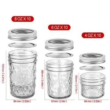 Show moreIntroducing the **VERONES Mason Jars Canning Jars** set, the perfect blend of practicality and charm for all your food storage needs. This versatile collection includes **30 high-quality glass jars** in three convenient sizes: **10 jars of 4 OZ**, **10 jars of 6 OZ**, and **10 jars of 8 OZ**. Each jar comes with a durable **silver lid**, ensuring that your favorite preserves, jams, spices, or DIY creations stay fresh and delicious. Designed for both functionality and aesthetics, these vintage-style **quilted jelly jars** will not only keep your food safe but will also enhance any décor. Thanks to their **food-grade materials**, you can rest easy knowing that your food is stored safely, making these jars an essential addition to your kitchen.