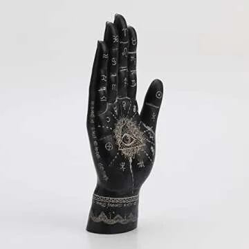 Show moreElevate your decor with the Veronese Design 9 1/2 Inch Ancient Mystic Palmistry Hamsa Hand Palm Reading Black Resin Sculpture. This captivating piece masterfully intertwines mysticism and elegance, featuring a mysterious sigil and the iconic eye of providence. Crafted with meticulous attention to detail, the sculpture exudes an aura of ancient wisdom, making it a perfect addition to any spiritual setting or a striking centerpiece in your home. Intricately cast in high-quality resin and hand-painted by expert artisans, each sculpture resonates with unique artistry and charm, ensuring that no two pieces are exactly alike. With measurements of L4" x W2 1/2" x H9 1/2", it fits perfectly on desks, shelves, or as a statement piece on your mantle, drawing the eye and sparking conversation.