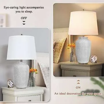 Show more Introducing the VerRon Bedside Table Lamp, a stunning blend of elegance and functionality that enhances any space with its minimalist resin design. This lamp features a gracefully carved vase body, adorned with a charming distressed light grey finish that brings a touch of vintage allure to your home décor. With its white fabric lampshade, this modern table lamp is more than just a source of light; it is a beautiful piece of art that complements various design styles, including rustic, farmhouse, urban, and minimalist.