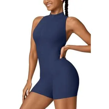Vertvie Workout Jumpsuits for Women Zip Up Tummy Control Sleeveless One Piece Rompers Shorts V Back Scrunch Yoga Bodysuit(Navy Blue,Small)