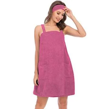 Veseacky Women Bath Wrap Towel for Shower with Pocket Adjustable Robe & Facial Headband Rose Red S