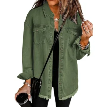 Vetinee Women's Oversized Boyfriend Elm Green Denim Jacket with Frayed Hem