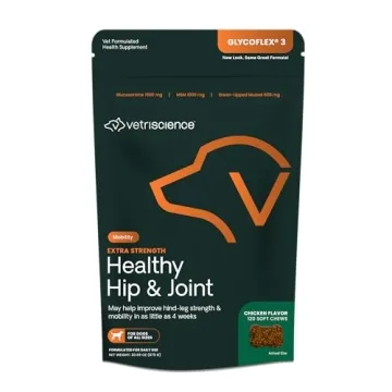 Show more Revitalize your dog's mobility with our premium VetriScience Extra Strength Healthy Hip & Joint Chews, a powerful glucosamine and green-lipped mussel joint support supplement! Often referred to as GlycoFlex Stage 3, this enhanced formula is lovingly designed to support aging pets or those navigating their most energetic years. Infused with 10 active ingredients such as glucosamine, MSM, DMG, and potent antioxidants, these chews encourage joint integrity, enhance strength, and boost mobility, ensuring your beloved companion remains spry and dynamic.