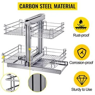 Show more Introducing the VEVOR Pull Out Blind Corner Cabinet, a game-changer for your kitchen organization. Designed with high-quality carbon steel, this cabinet organizer provides unmatched firmness and durability, ensuring it withstands the rigors of daily use. The polished chrome finish on its four spacious baskets not only adds a touch of elegance to your kitchen but also ensures rust-proof and corrosion-resistant functionality. With dimensions of 24.8 x 18.9 x 22.4 inches and adaptability for cabinets of size 31.5 x 21.6 x 25.6 inches or larger, it guarantees a perfect fit for your home, while the 15.7-inch minimum opening makes installation seamless.