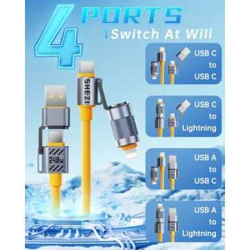 Vexipia 4 in 1 USB C Cable Lightning Cable,240W Fast Charging & Data Transfer,iPhone iPad Charger Cord with Lightning/Type C/USB A for iPhone 16/15/Macbook,IPad,5FT Yellow [SHEZI Series]