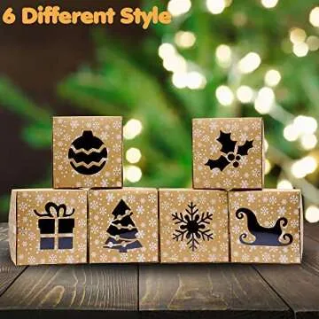 Show more Introducing the VEYLIN 24Pack Christmas Bakery Boxes with Window, the perfect decorative solution for all your holiday gifting needs! Each set contains 24 charmingly designed cookie boxes, featuring six delightful transparent window patterns, including festive icons such as a festive gift box, snowflake, Christmas tree, Christmas ball, sled, and Christmas fruit. These boxes are expertly crafted to provide functionality and aesthetics, making them a must-have for anyone looking to spread holiday cheer with baked treats and confections.